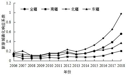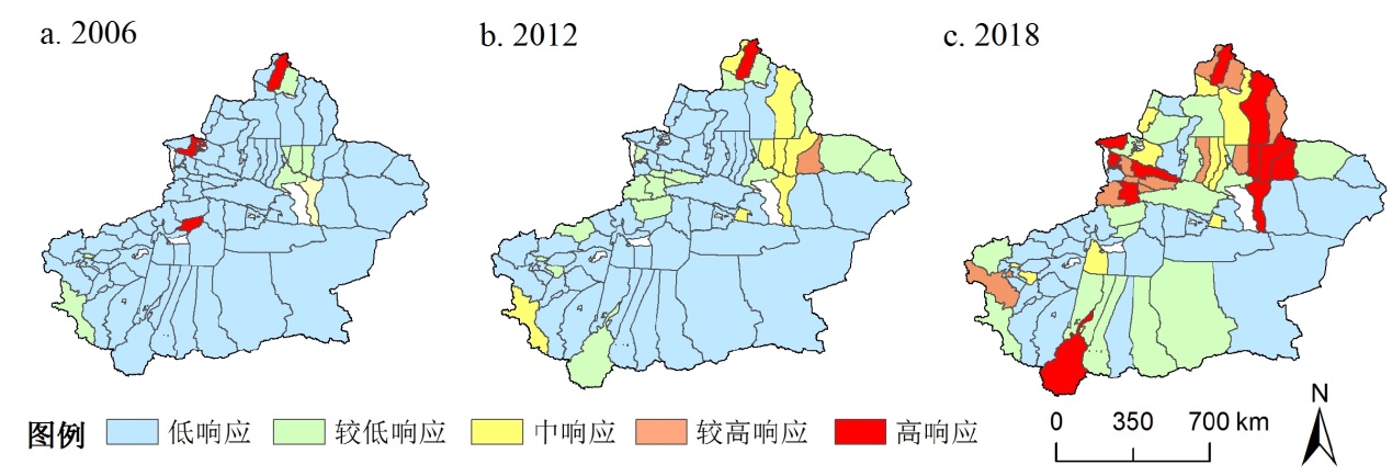 (2)2006—2018年,新疆县市旅游城镇化高响应区呈现由“点状”离散分布向“片状”集中分布的演变趋势,研究期内各县市之间旅游城镇化响应强度的空间差异逐渐缩小。