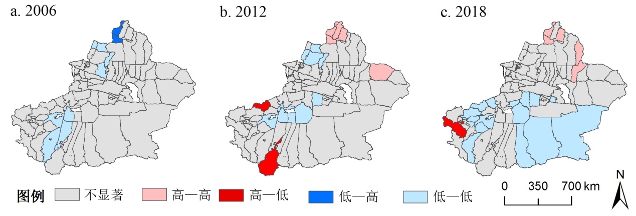 (3)2006年、2012年和2018年3个时间节点呈现空间正相关关系的县市分别占全疆县市的9.4%、16.5%和25.9%,表明新疆县市旅游城镇化响应强度的空间集聚现象愈发明显。
